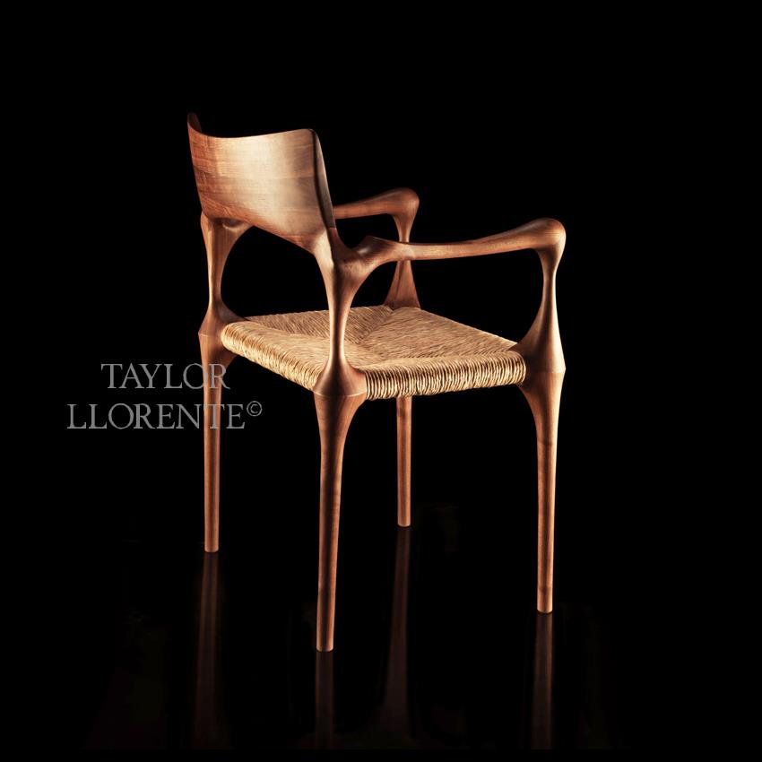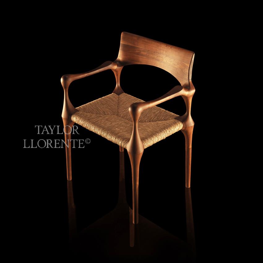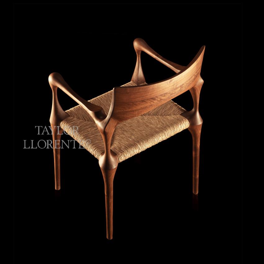 Walnut chair carved and sculptured from the highest grade American walnut wood. Each piece illustrates the beauty of this highly figured walnut wood. Each unique chair is created, finished & oiled by hand by highly skilled craftsmen. Available with seats covered in client’s own fabric/leather or the leathers/fabrics of the collection. Or with woven seat on request.