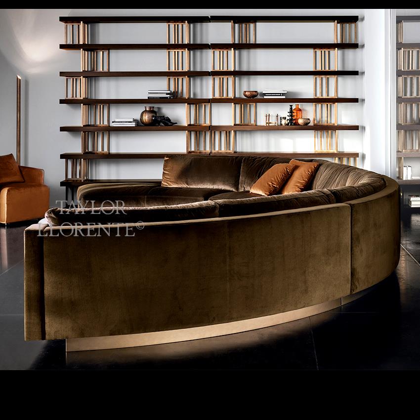A high end contemporary and luxurious design modular sofa with sumptuous crescent design pictured in dark walnut velvet. Lacquered brass metal plinth.