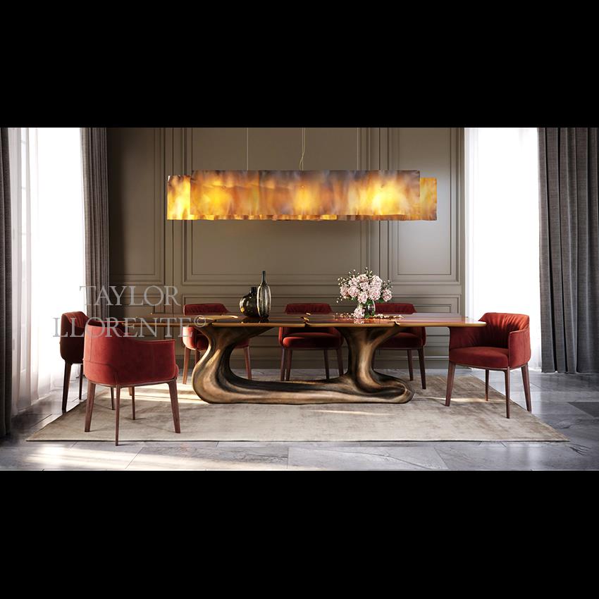 A high end luxurious dining table created with sculptural table base and burr walnut top.