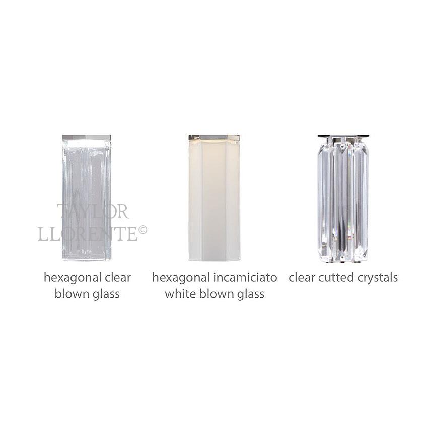 Glass elements: in either clear cut hexagonal crystals (priced below) or white blown glass (with a downcharge).