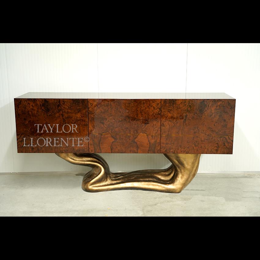 The fiberglass base of the credenza can be finished in either matt or high gloss finish. All colours (RAL colour wheel) are available, to also include other more unusual finishes such as, for example, bronze, gold, silver and or copper (these being a lacquer finish and not an actual metal leaf). Metal leaf finish on the base is available with a surcharge.